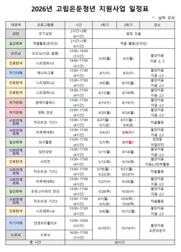 • 총 80시간 진행 (심리 회복, 관계 형성, 사회활동 지원 등)