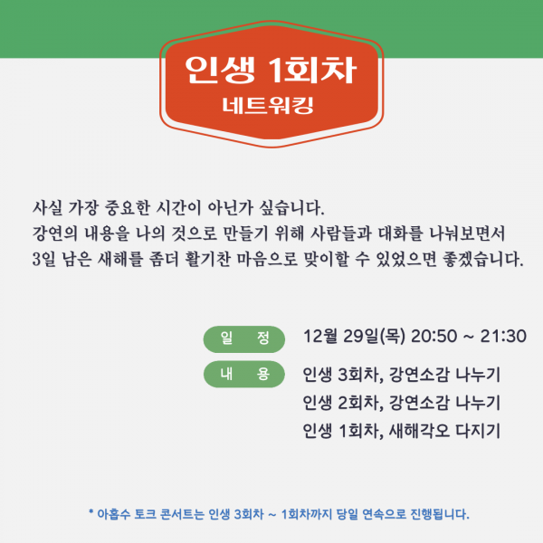 담당자가 아홉수라 넘나 고민이 많던 와중,, 같은 아홉수들은 다같은 고민을 하는구나! 를 알게 되어 기획하게 된! 아홉수 토크콘서트!! 힘든 건, 고민되는 건, 함께 나눌 수록 줄어듭니다!! 우리보다 먼저 인생을 살아가고 있는 인생N회차 분들의 삶을 통해 우리의 삶도 알아가보자고요!! 20대 후반 홧팅!